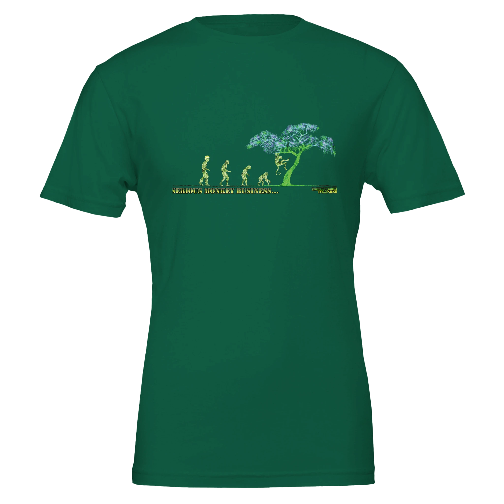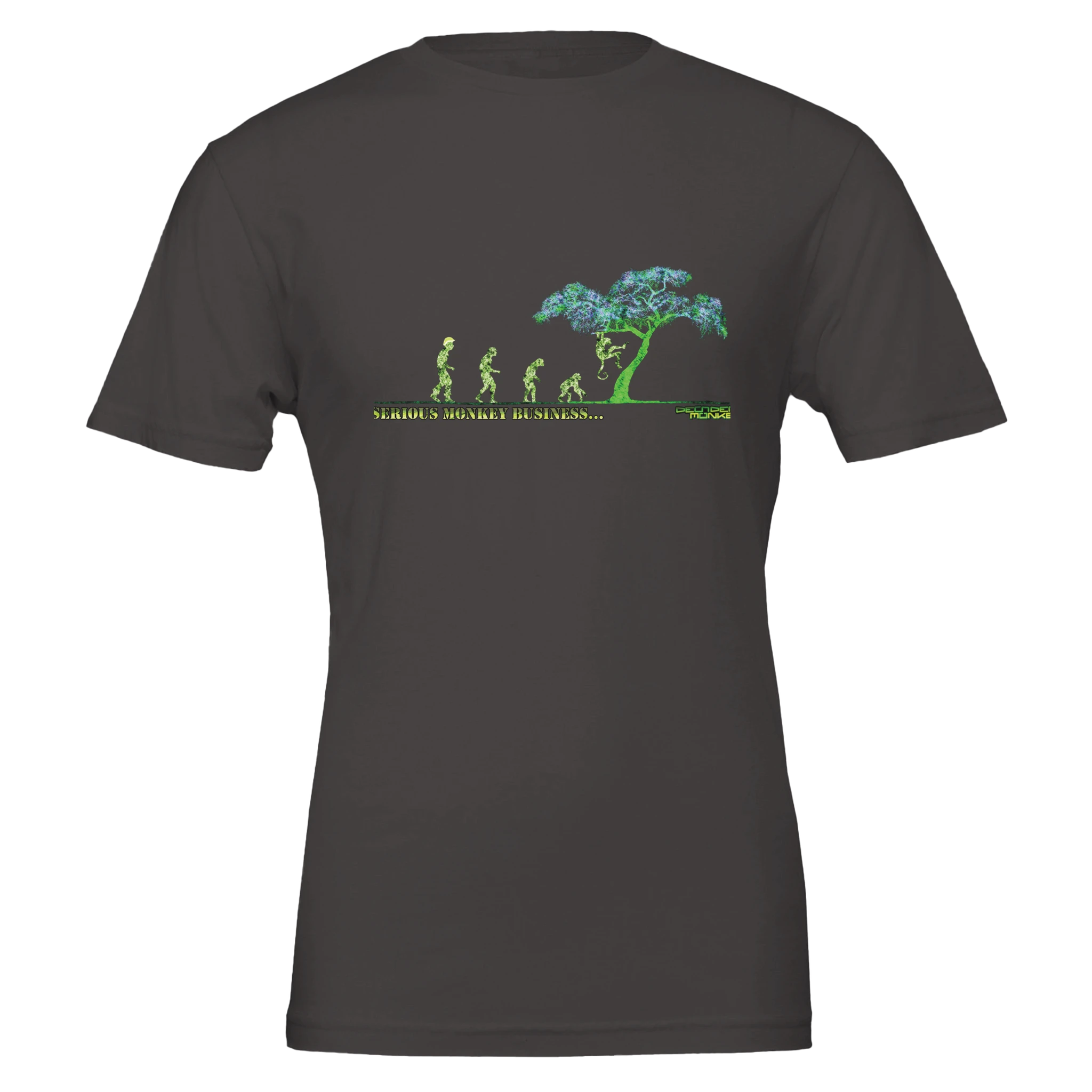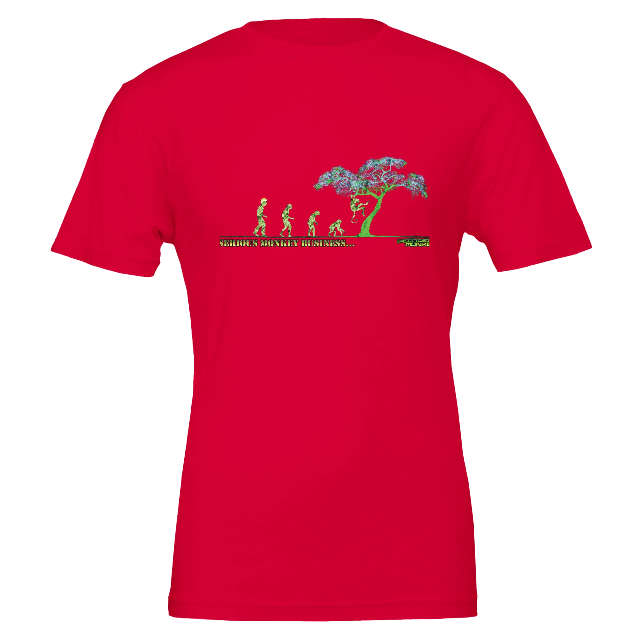 Meet the tee that flips evolution on its head! Starting with a human in a yellow safety hat — think engineer vibes — the silhouettes walk backwards through a vibrant African-inspired scene, transforming into a chimpanzee climbing a tree. Each figure bursts with off-reality colours, turning a classic evolutionary march into a playful visual story.